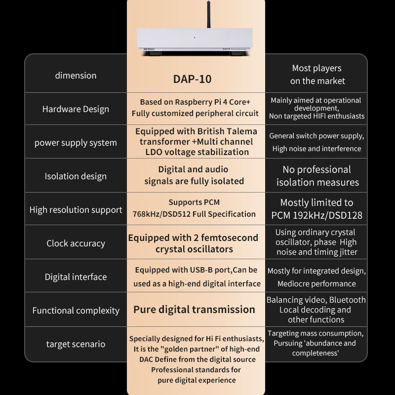 DAP-10 Hi-Fi плејерот е прецизно изработен за аудиофили, служи како совршен компаньон за хај-енд DAC-ови. Тој го поставува професионалниот стандард за дефинирање на чист дигитален доживот од дигиталниот извор.